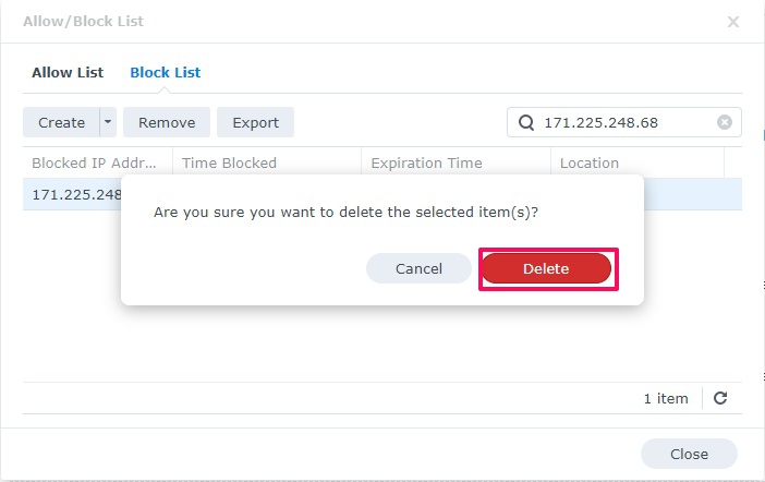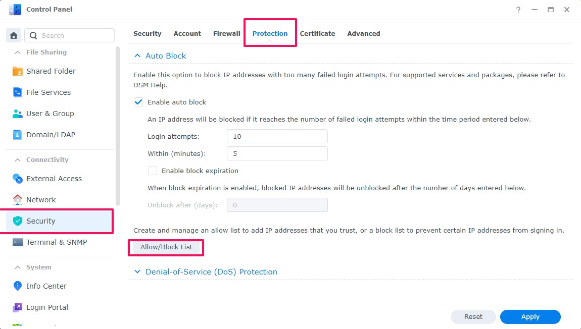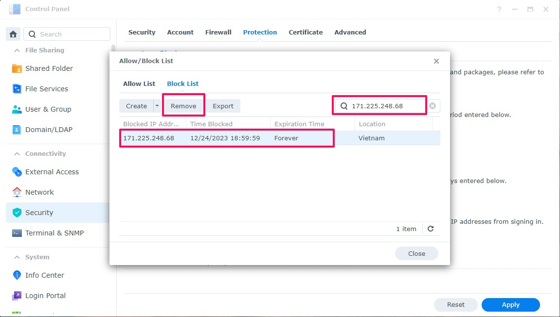 Để gỡ bỏ IP bị chặn, bạn cần đăng nhập vào NAS bằng một thiết bị khác trong mạng LAN, sau đó vào phần Control Panel > Security > Protection và tìm đến Allow/Block List.