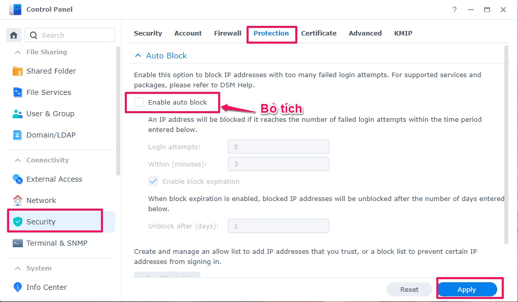 Có thể bỏ chọn auto block để tắt tính năng tự động khóa IP xâm nhập của NAS.
