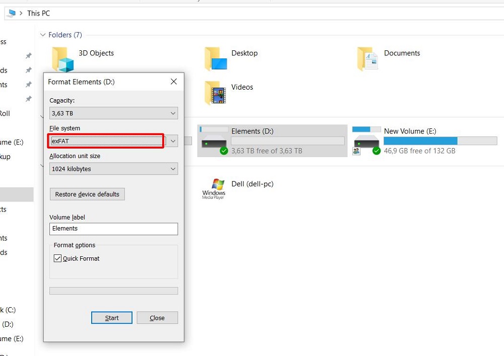 Tại hộp thoại của windows bạn có thể đặt lại tên ổ, chọn định dạng muốn format, mặc định sẽ ở định dạng file cho windows (NTFS), ở đây mình sẽ định dạng cho ổ thành exFAT, một định dạng phổ biến mà hầu hết các thiết bị đều nhận từ điện thoại, PC, máy MAC, TV, đầu kỹ thuật số vv.