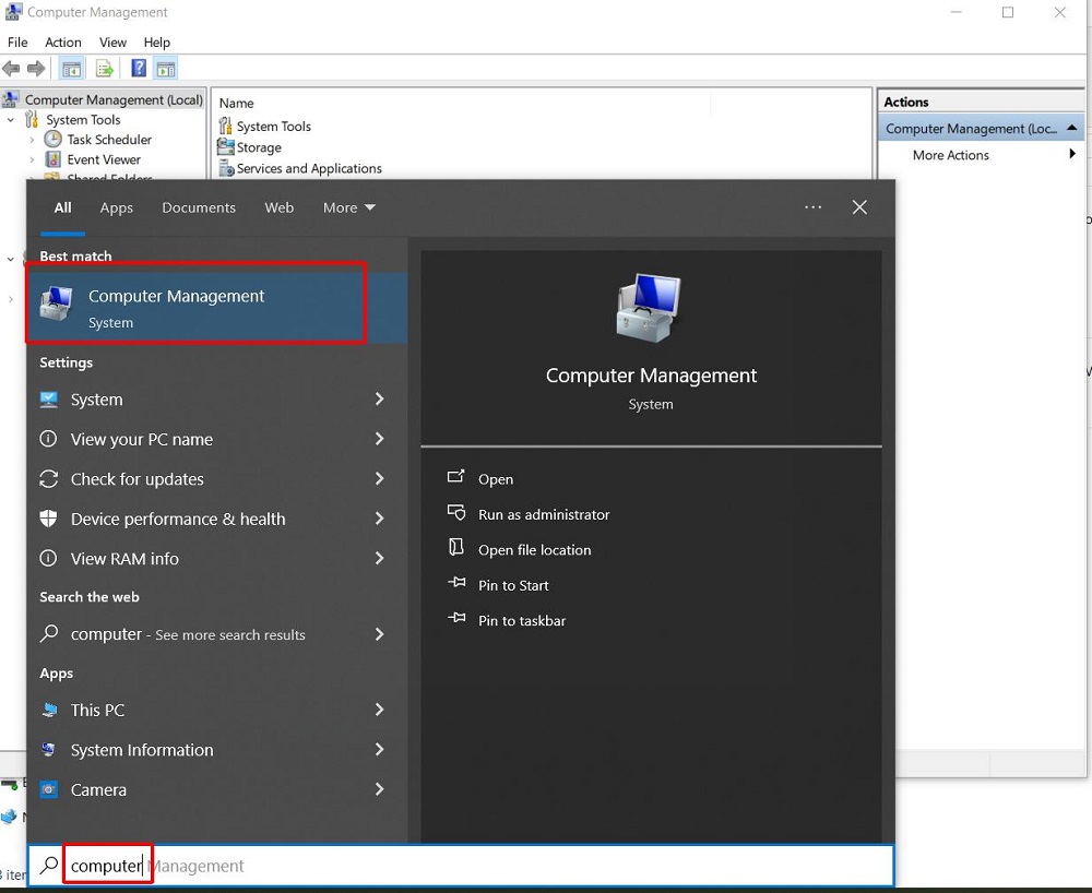 Tại windows bạn gõ: computer Management, sau đó chọn biểu tượng “Computer Managerment” để mở cài đặt
