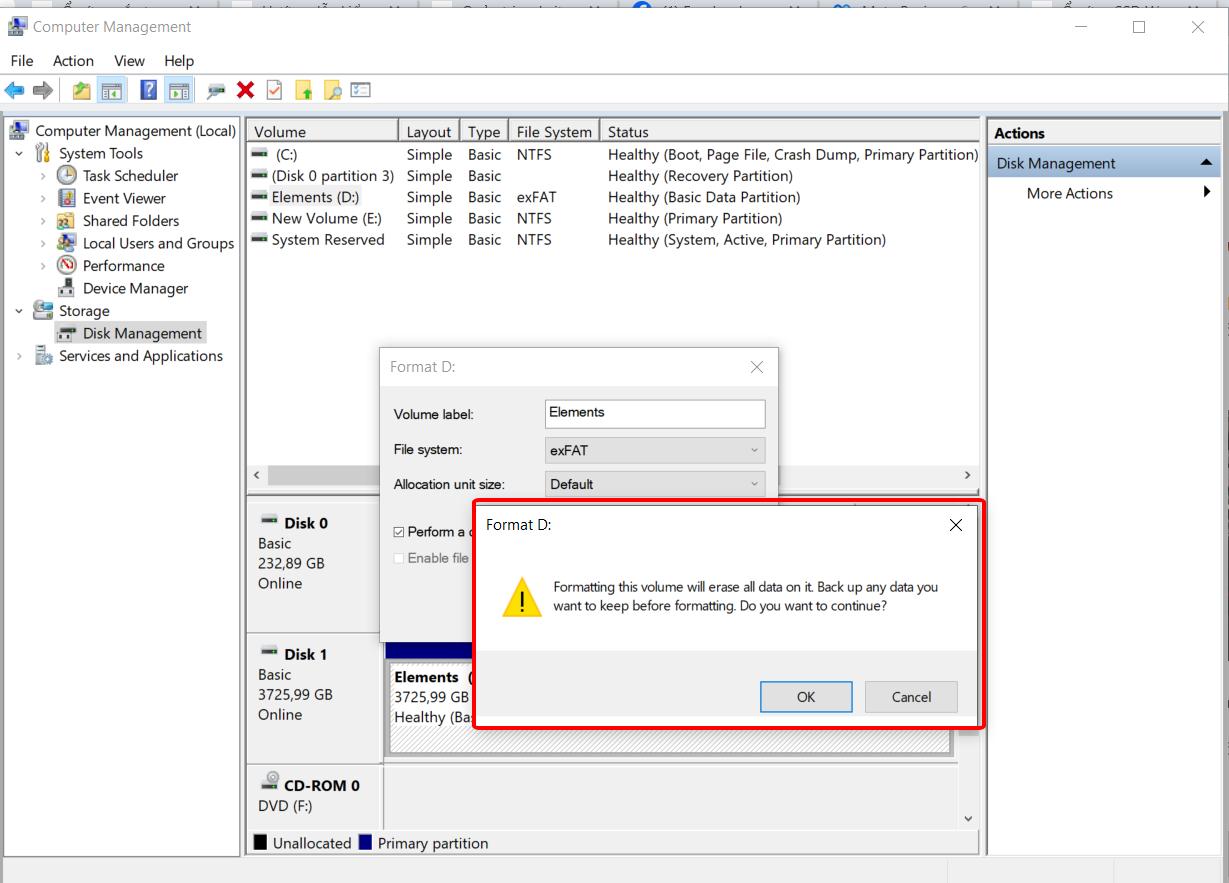 Tại đây bạn có thể đặt lại tên ổ, chọn định dạng muốn format, ở đây mình vẫn để là exfat, sau đó hệ thống sẽ cảnh báo việc xóa toàn bộ dữ liệu trên ổ.