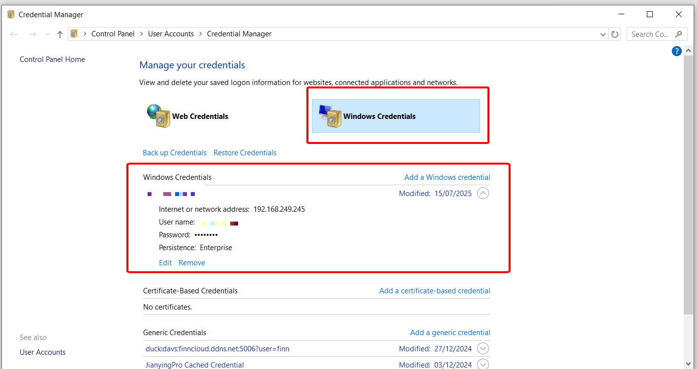 Bạn có thể tìm thấy các phiên đăng nhập vào NAS tại đây, sau đó chọn và Remove, sau đó khởi động lại máy tính. Sau đó truy cập lại vào tên hoặc IP của nas điền tài khoản, mật khẩu truy cập bình thường.