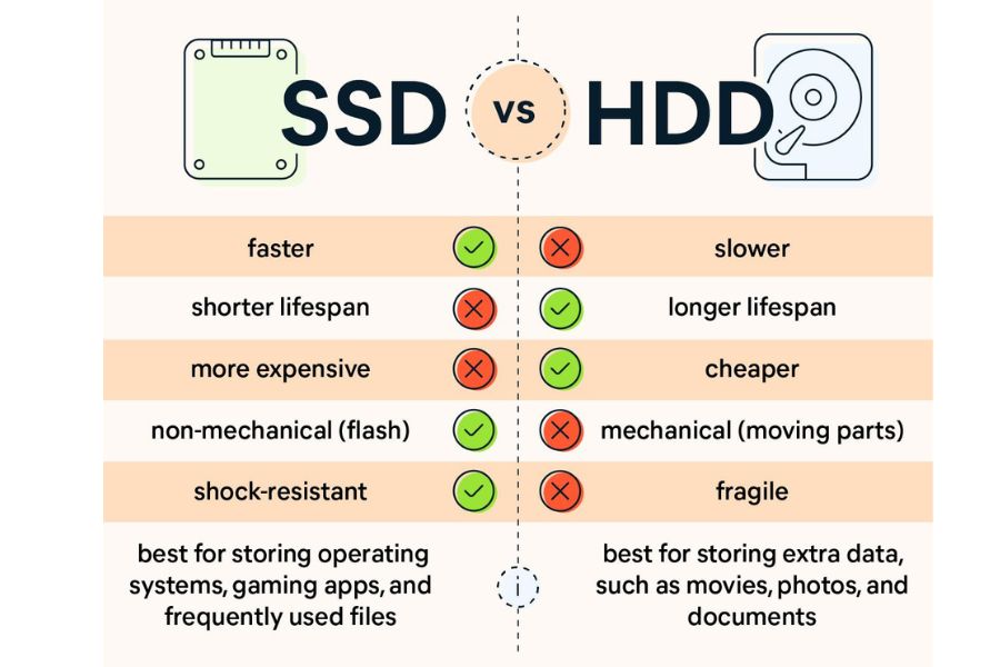 Trong môi trường lưu trữ hiện đại, cả HDD và SSD đều có vai trò riêng. SSD nổi bật với tốc độ truy xuất nhanh, phù hợp cho các dữ liệu cần truy cập thường xuyên.